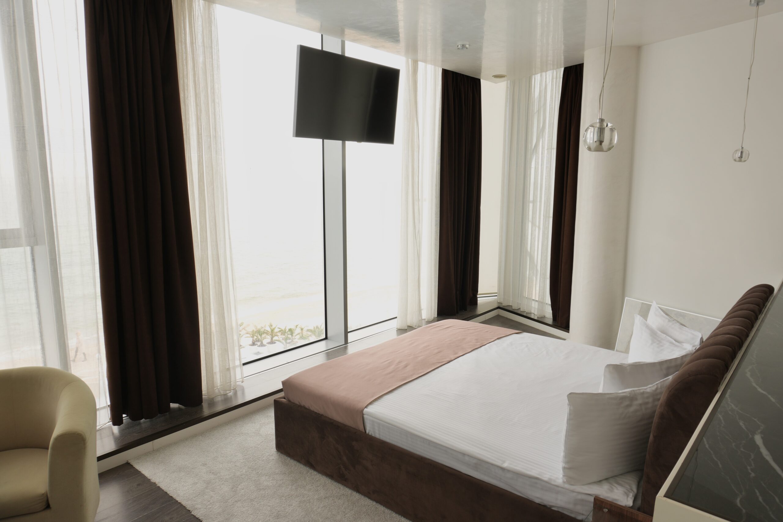 Ексклюзивний номер із шестиметровою панорамою на море. Скляна стіна створює відчуття відкритого простору, наповнює інтер’єр природним світлом і відкриває безперервний морський горизонт. У номері передбачена елегантна зона відпочинку та письмовий стіл для роботи чи творчості.