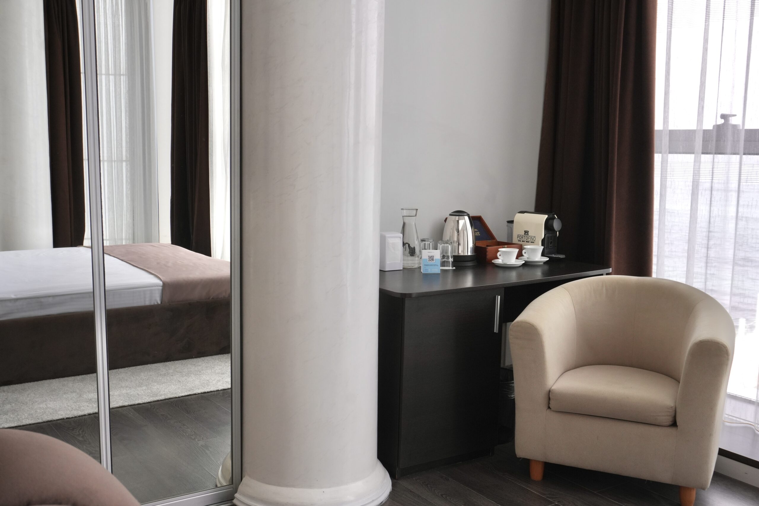 Номер обладненний кавоваркою та чайником з преміальним набором для приготування гарячих напоїв.