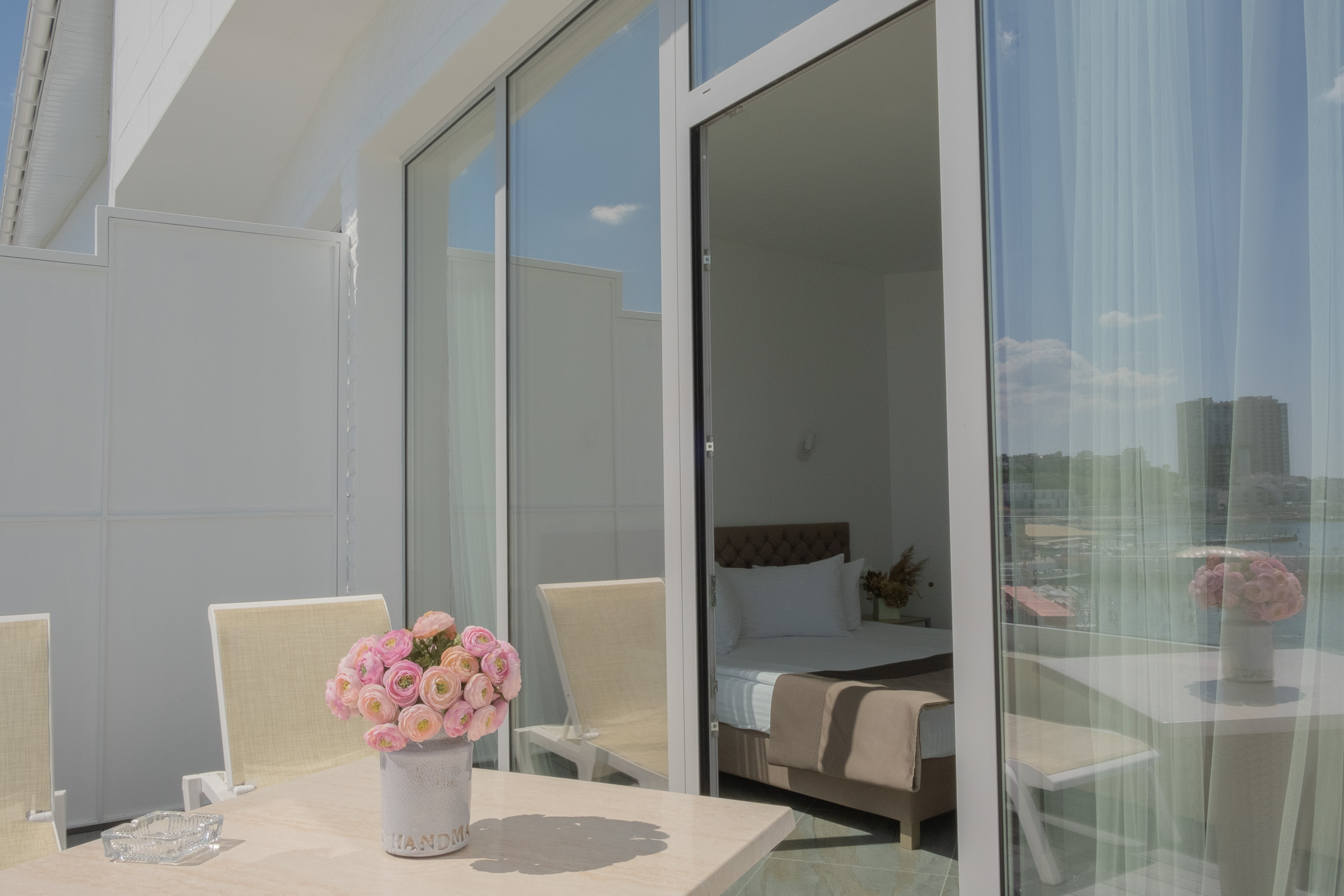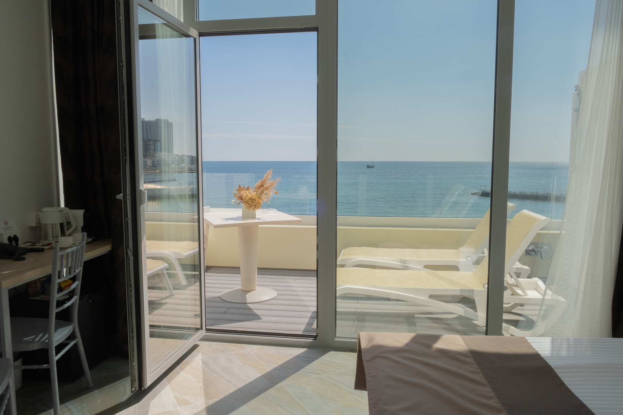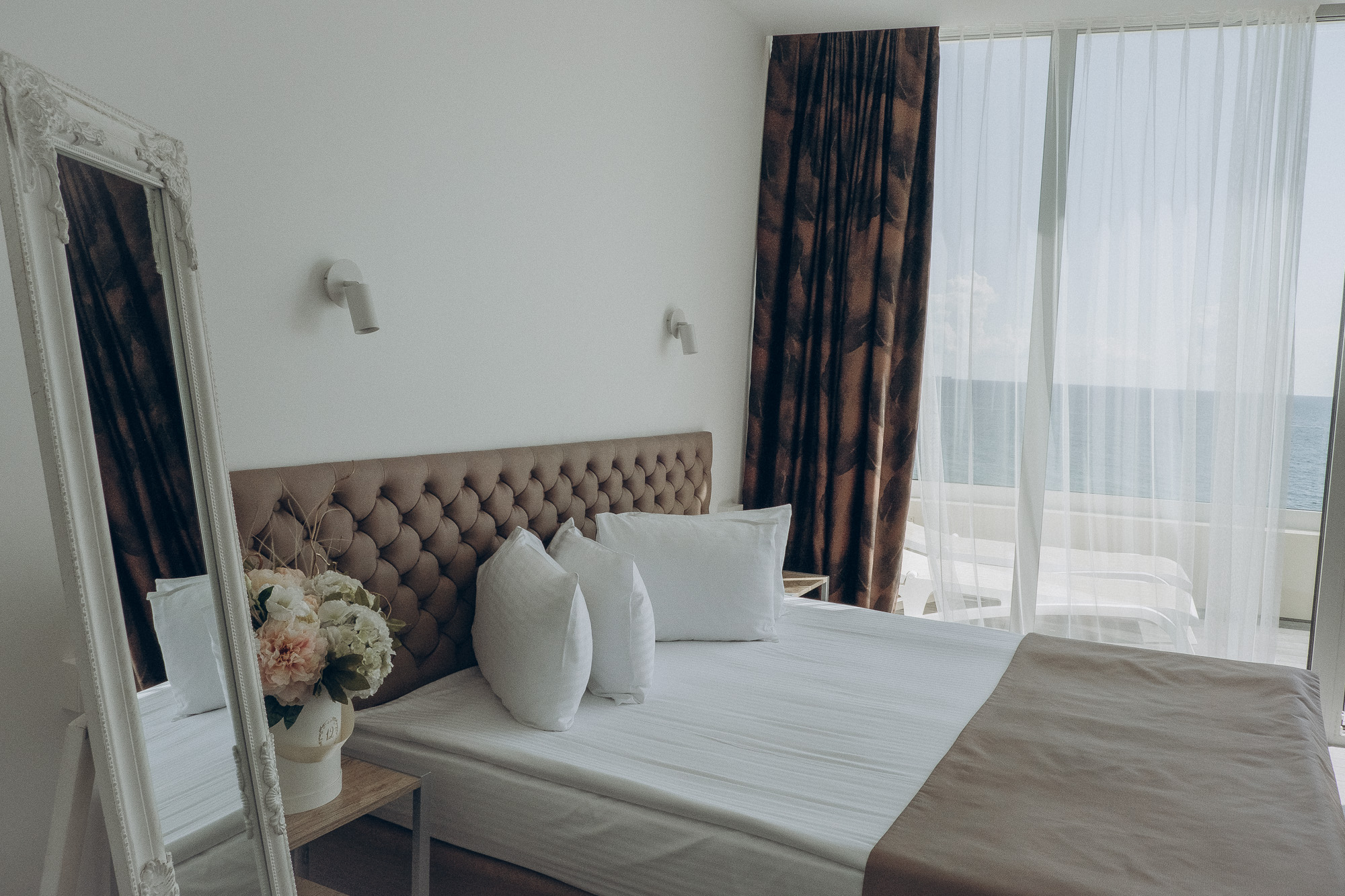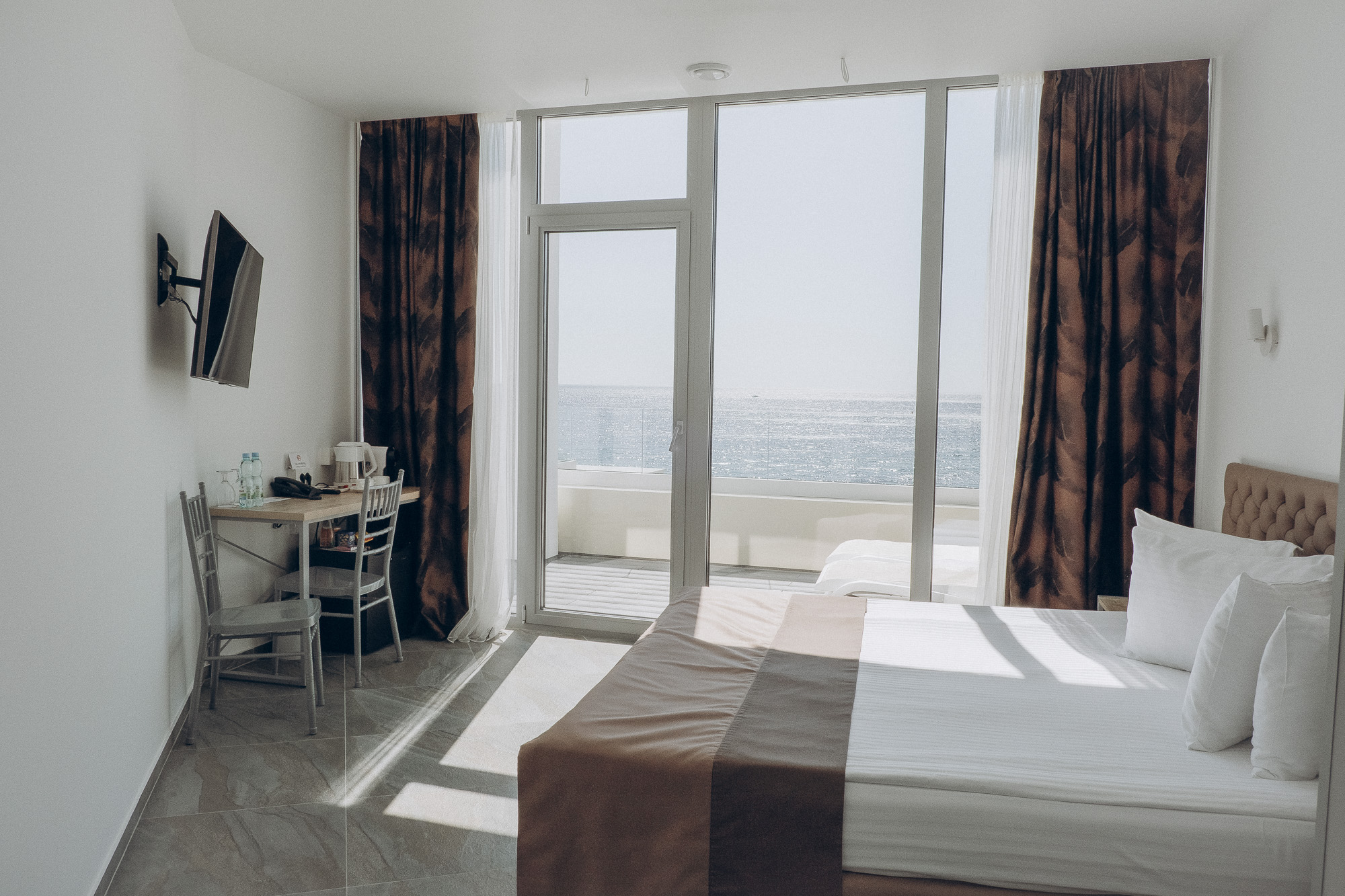 У всіх номерах категорії Стандарт з видом на море великі панорамні вікна, вид з вікон просто заворожує та забезпечує Вашому відпочинку атмосферу справжнього умиротворення. Поєднання світла та легкості, якості постільної білизни та французької парфумерії змусять Вас повернутися до нас знову. У вартість проживання входить сніданок, користування послугами пляжу: шезлонг, пляжні рушники, парасольки.