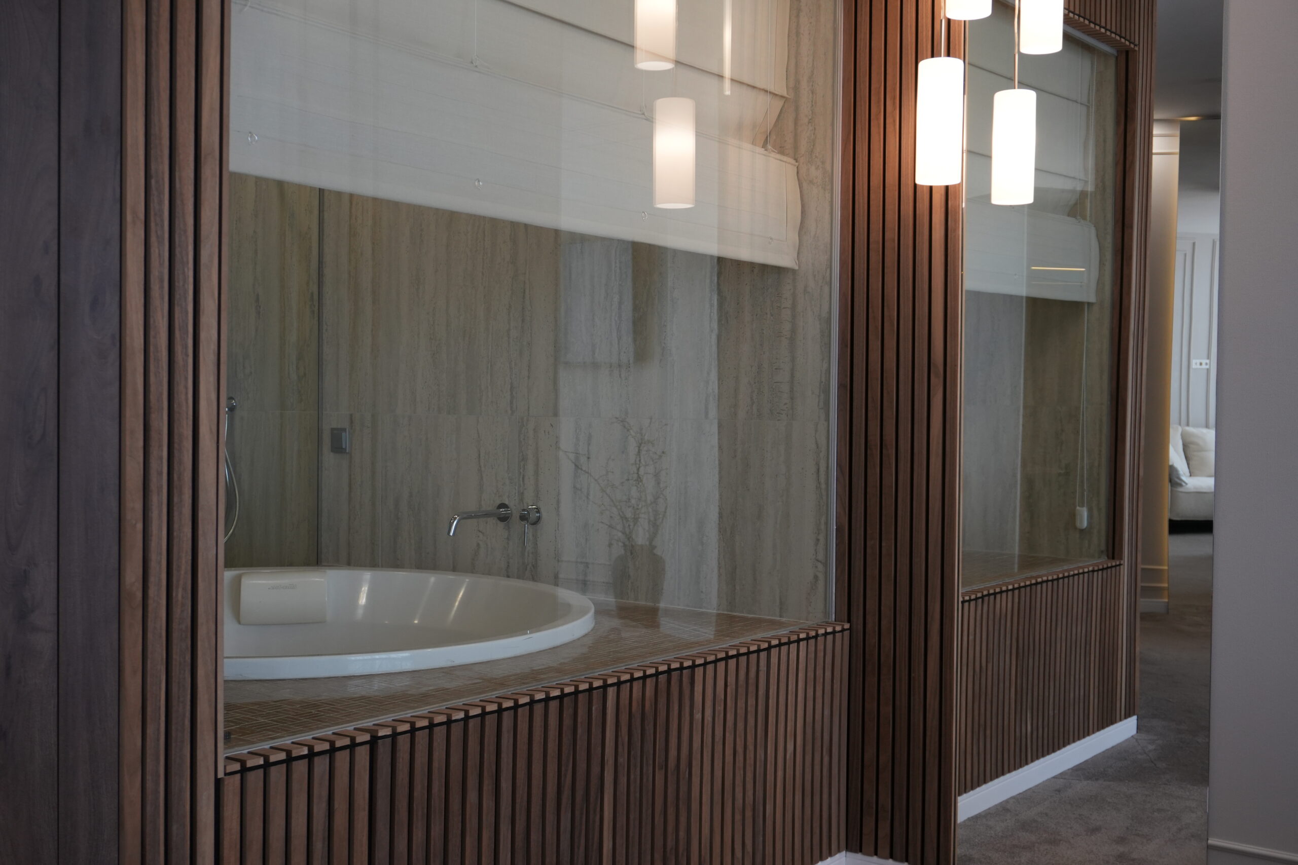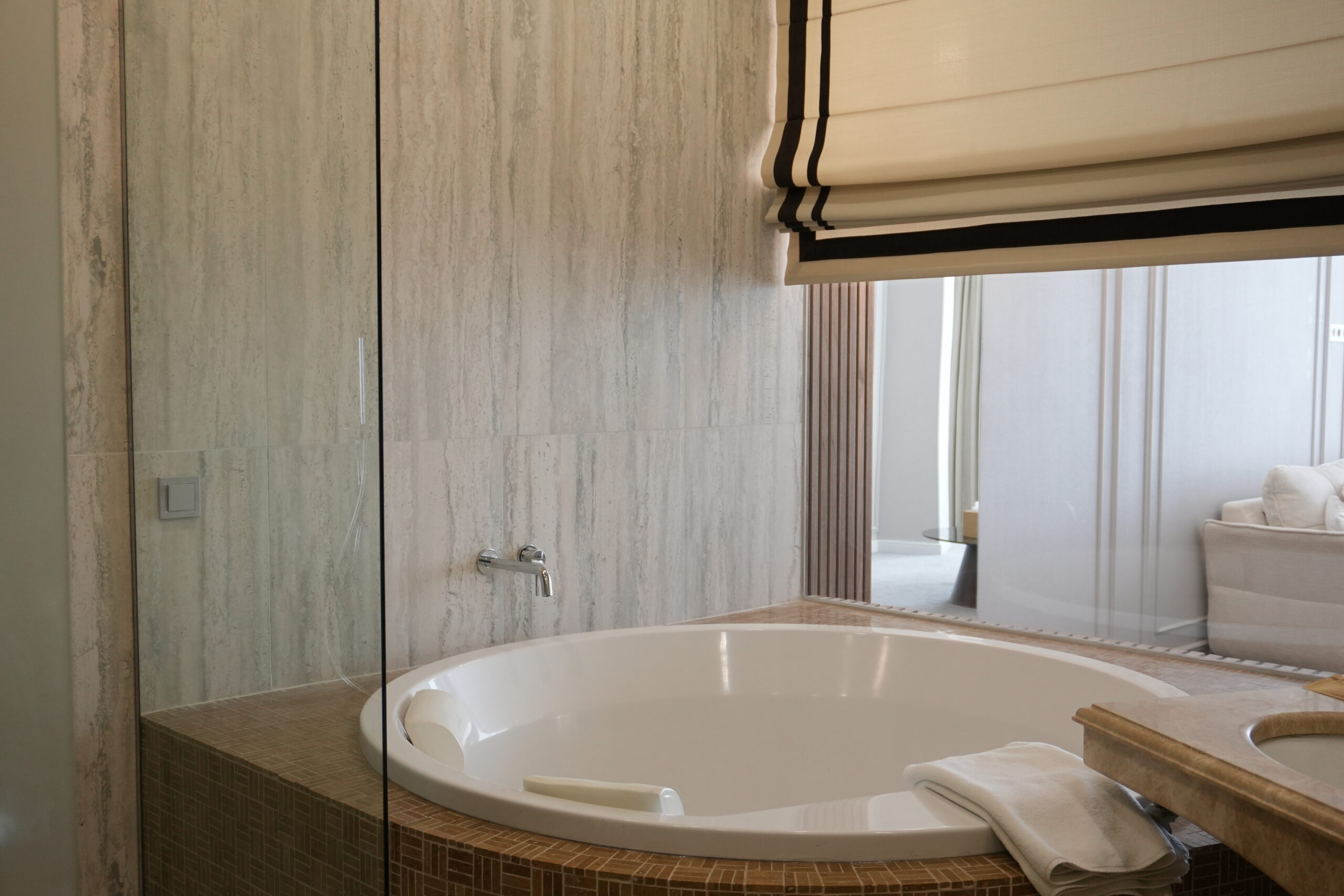 Простора ванна кімната з панорамним видом на море обладнана ванною-купіллю площею 2 м² та окремою душовою кабіною. До послуг гостей — широкий набір міні-парфумерії українського бренду, м’які халати, тапочки та фен.